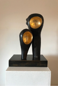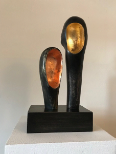 Description: Double abstract form with gold leaf. Fixed to a rectangular base.